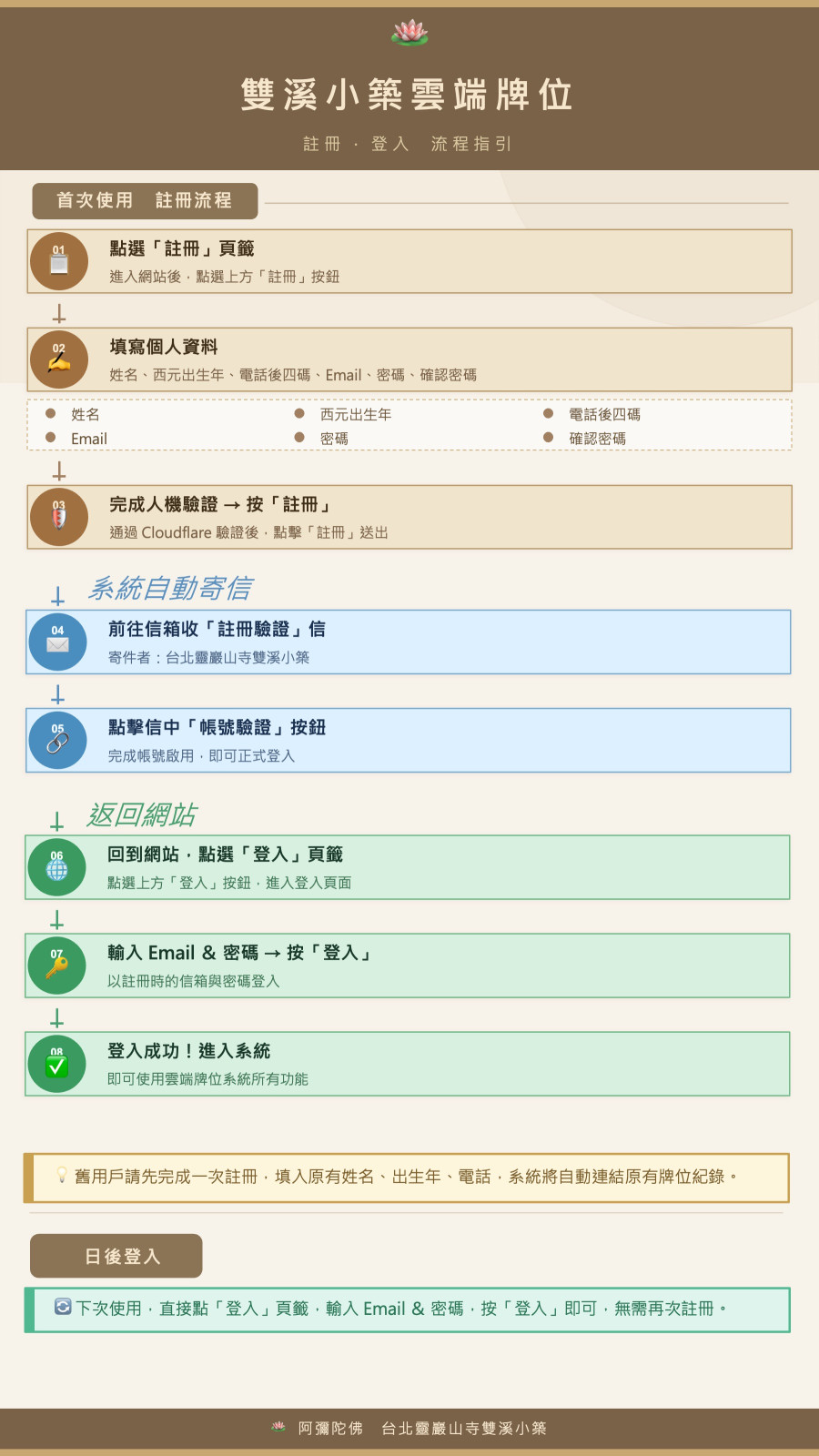 雲端牌位系統更新 2026 年 3 月 9 日 瀏覽數 105 雙溪小築「雲端牌位」今天已更新系統,全面改為郵箱、密碼註冊驗證及登錄。 若您曾以姓名、出生年、電話登入過,屆時於新系統註冊時,填入相同資料將自動沿用原有牌位紀錄。 分享至: