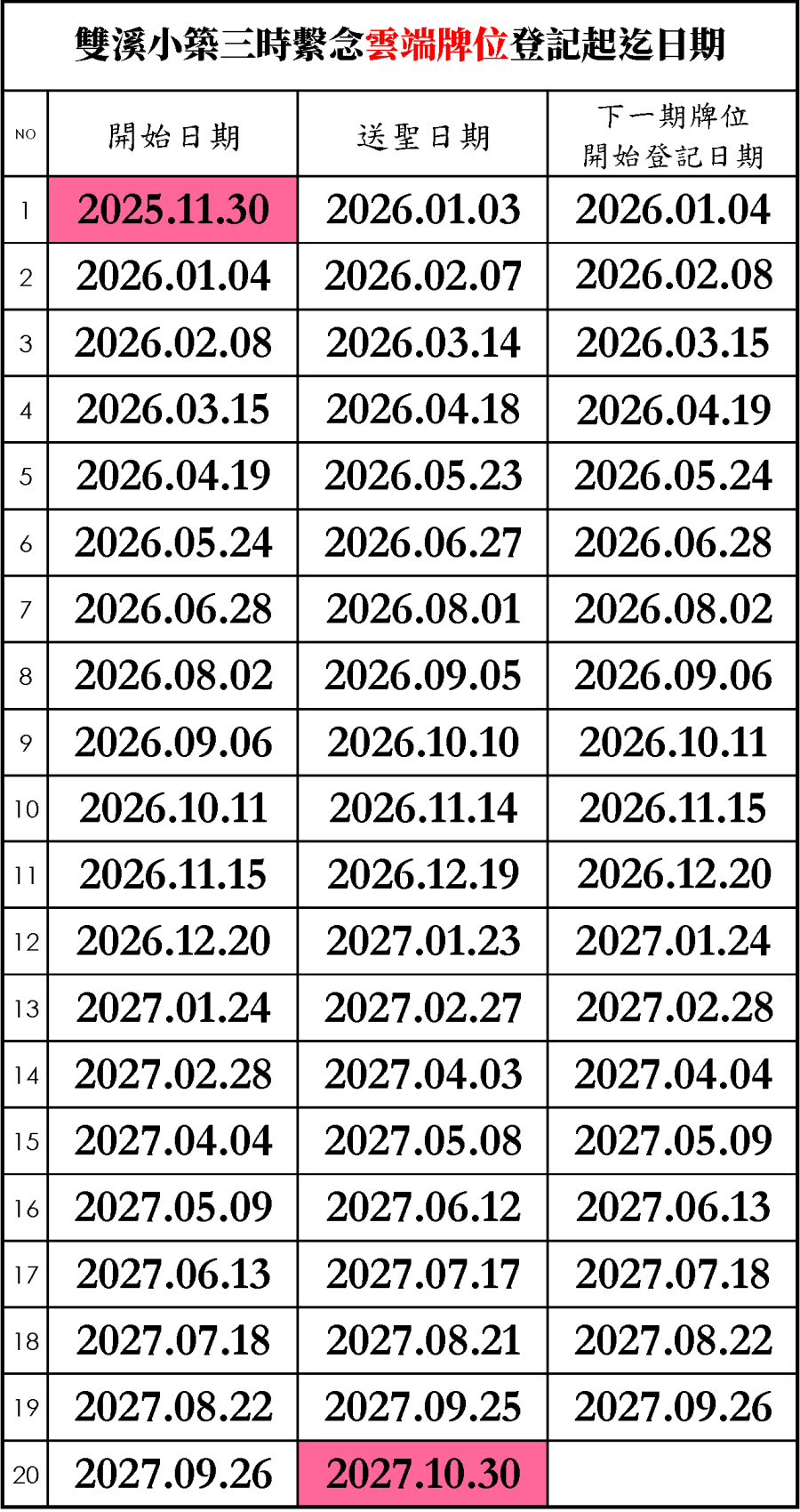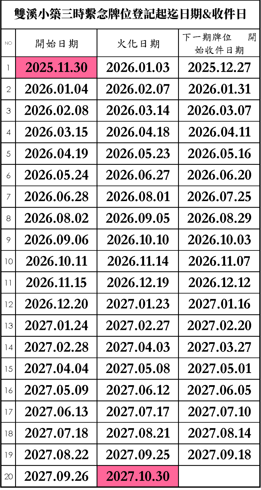 雲端牌位續立請參照下表,依下一期牌位填寫日期,再到系統重新登記。