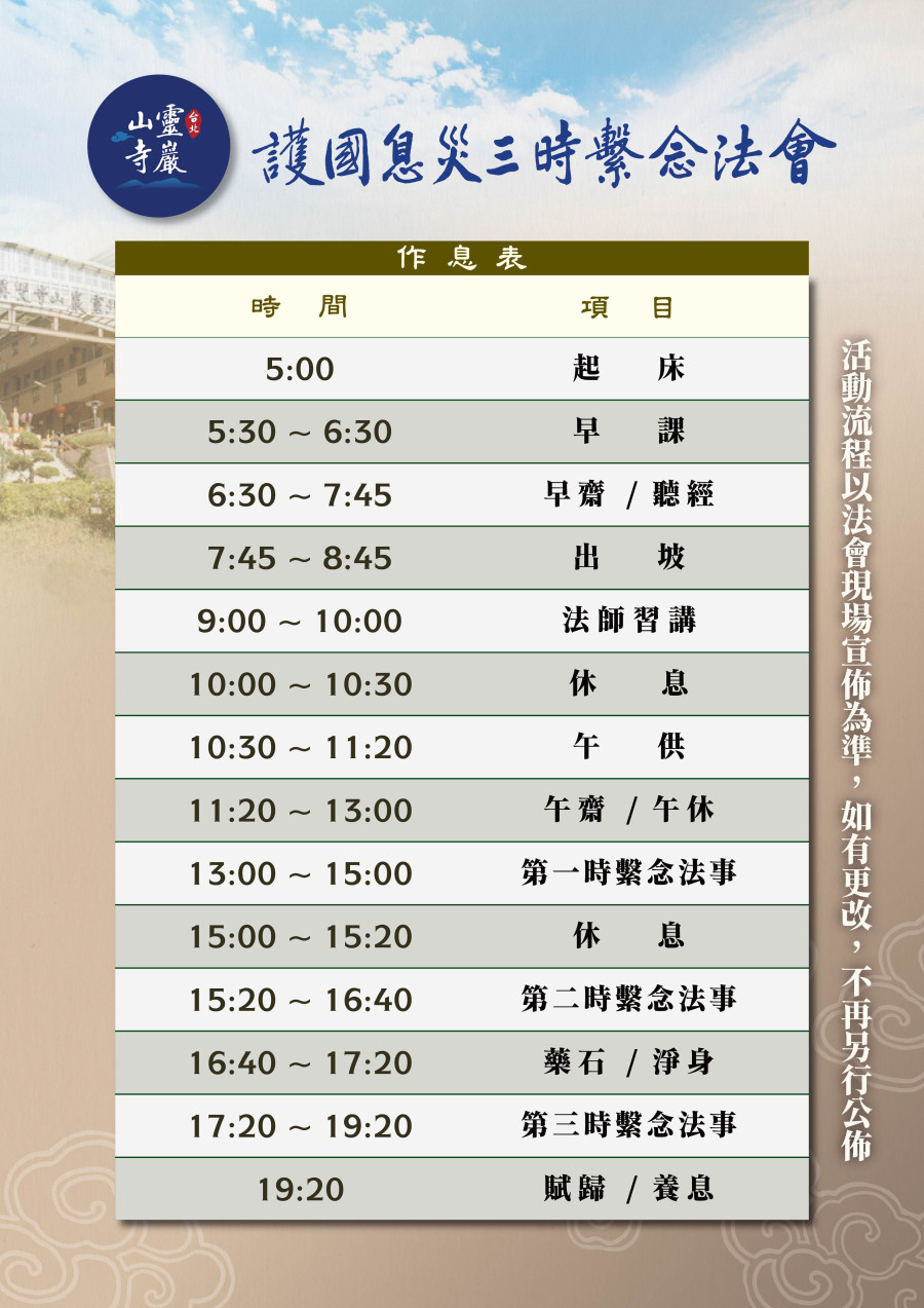 四、法會 19:40 圓滿,由本寺發車,分別開回台北、三重及雙溪火車站。