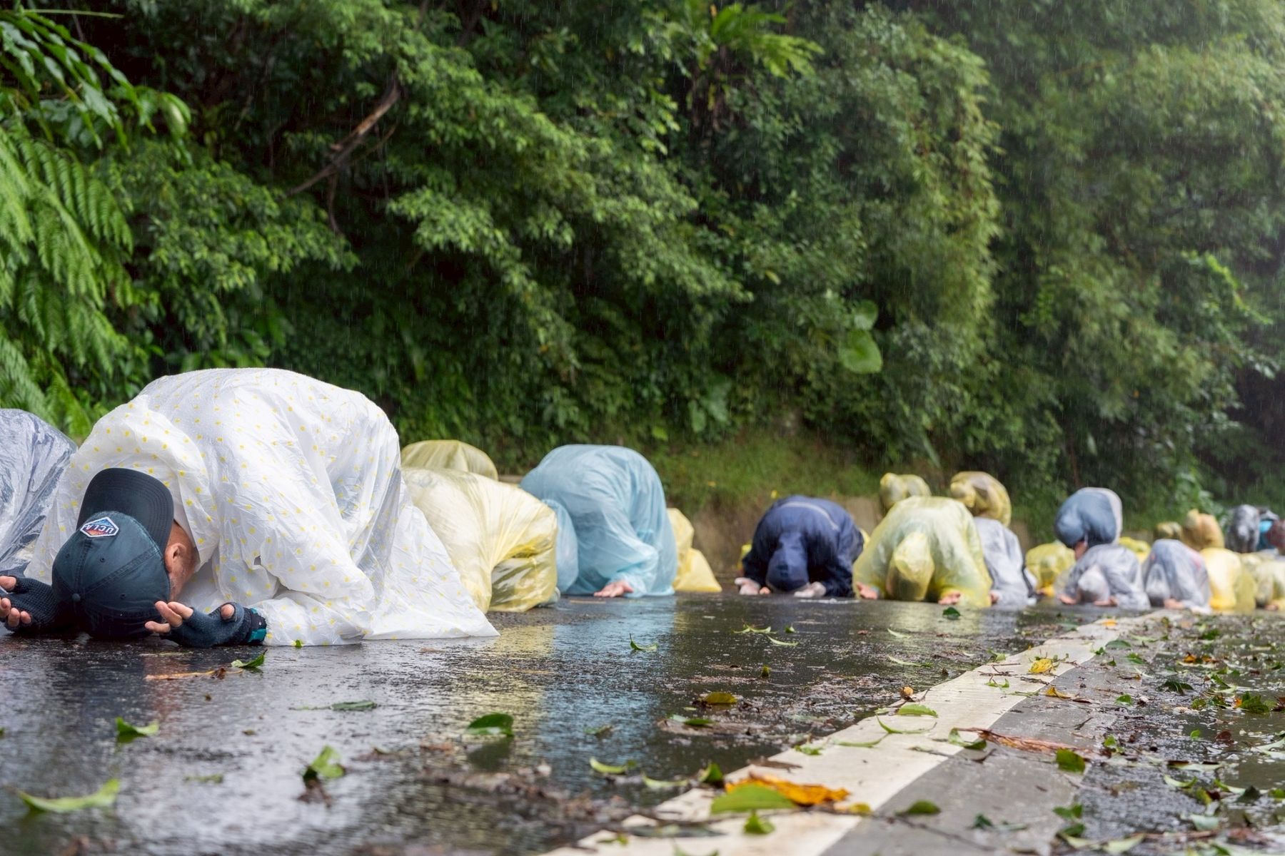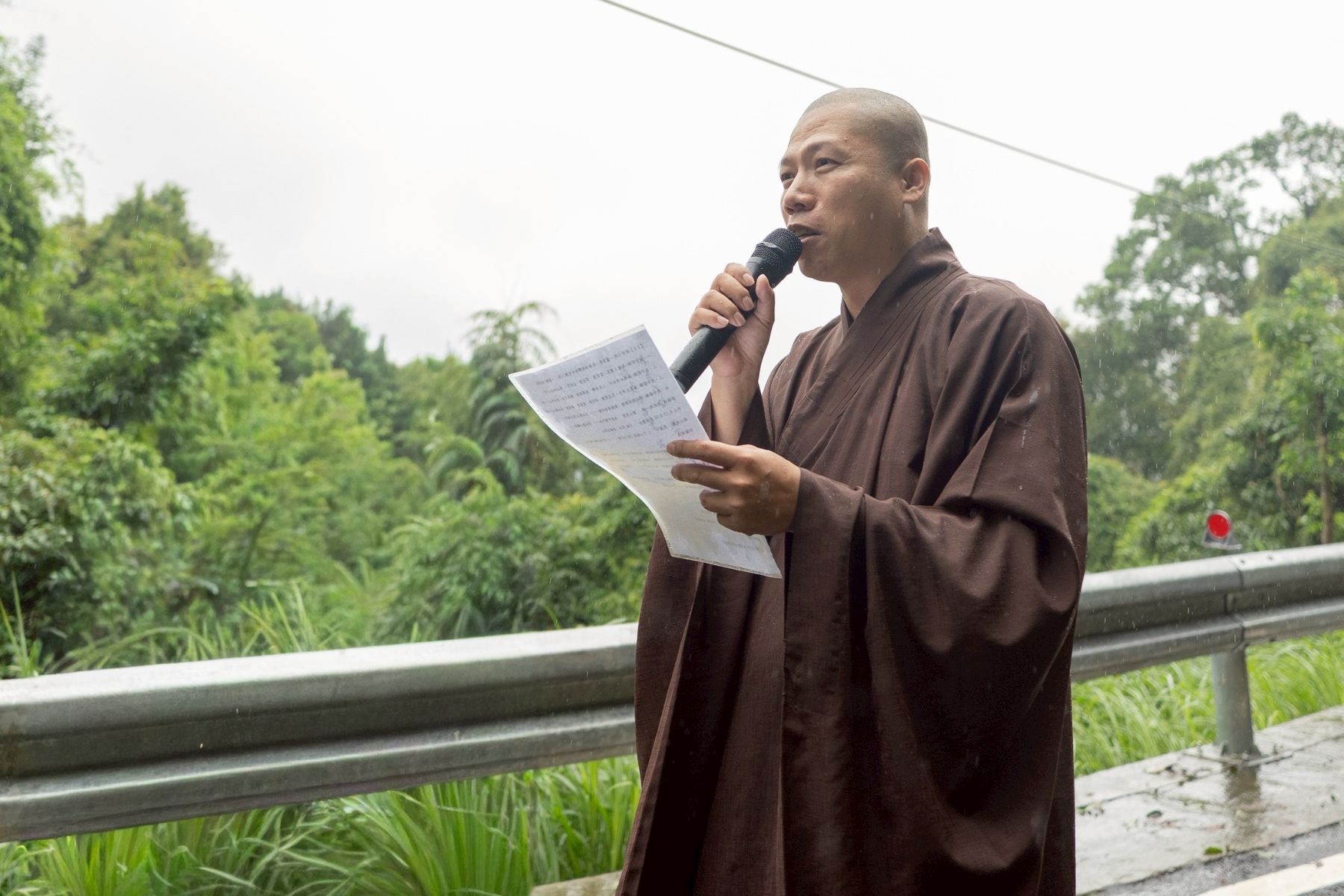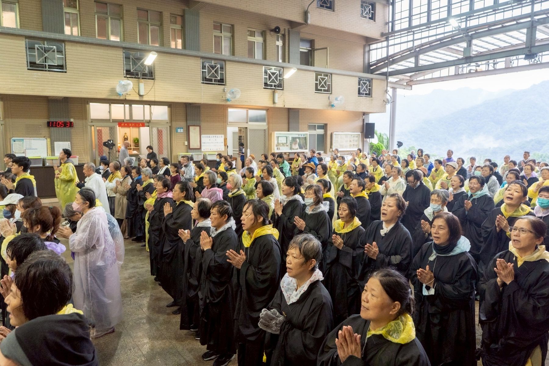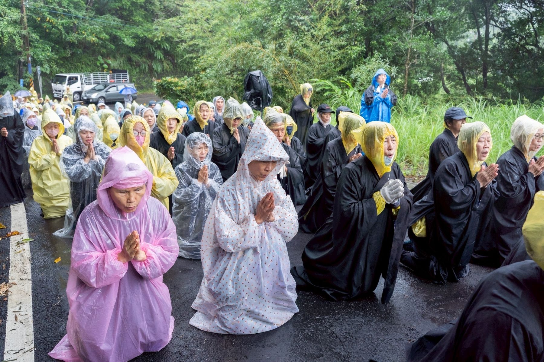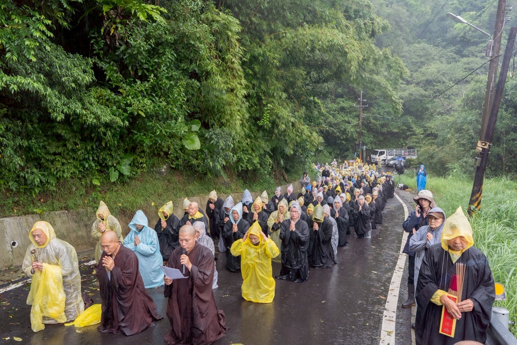 雨絲輕拂面頰,彷彿是佛菩薩的慈悲灑淨。大眾三步一拜,隨著阿彌陀佛的聖號,身體伏地,心也一點一滴的沉澱下來。每一次的俯身,都是一次放下;每一次的起身,都是一次昇華。這不僅是身體的行動,更是淨化心靈的修行。